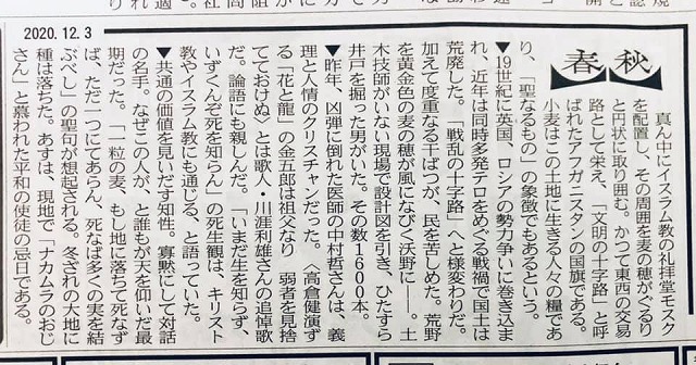 昨年の今日、アフガニスタンで中村哲さんが凶弾に倒れた。1600の井戸を掘った人だ。「一粒の麦、もし地に落ちて死なずば、ただ一つにてあらん、死なば多くの実を結ぶべし」の聖句が想起される。本日もよろしくお願いします。頑張りましょう。