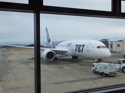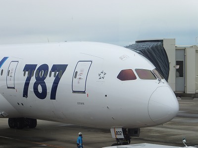 ボーイング787、世界初の定期便、岡山空港。写真撮りました。乗りました。