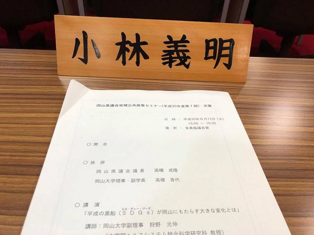 15時から、「県議会全員協議会室」で開催された『岡山県議会地域公共政策セミナー』に出席しました。本日の講師は、岡山大学副理事で大学院ヘルスシステム統合科学研究科教授の狩野光伸先生。テーマは、「平成の黒船(SDGs)が岡山にもたらす大きな変化とは」でした。