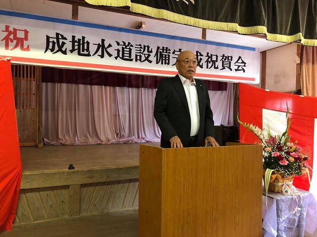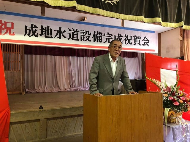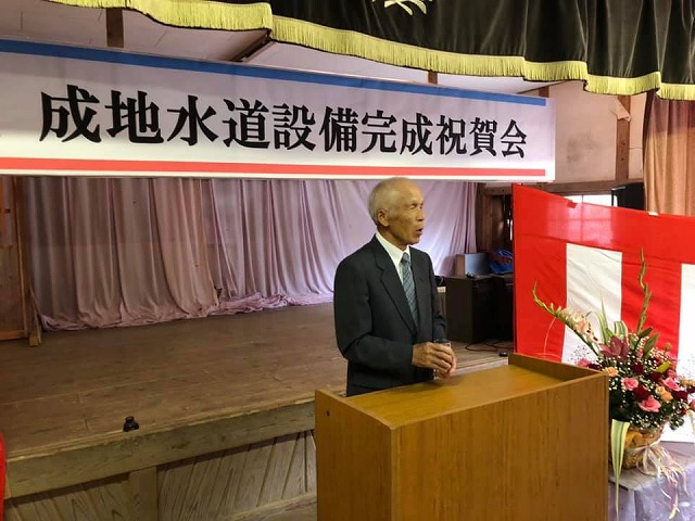 10時から、「成地公民館」で開催された『成地水道設備完成祝賀会』に出席しました。一言、お祝いとご慰労のご挨拶をさせて頂きました。成地地区に水道が通った。