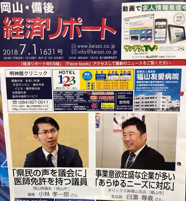 『経済リポート』の表紙を飾っているのは、同期の小林孝一郎県議です。凄いな。