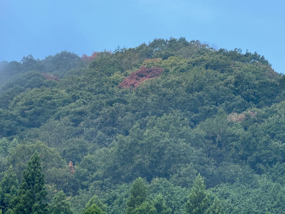 「ナラ枯れ」被害が心配だ。朝歩きの途中で目を向けると、茶色い木。ふく、朝から不機嫌。