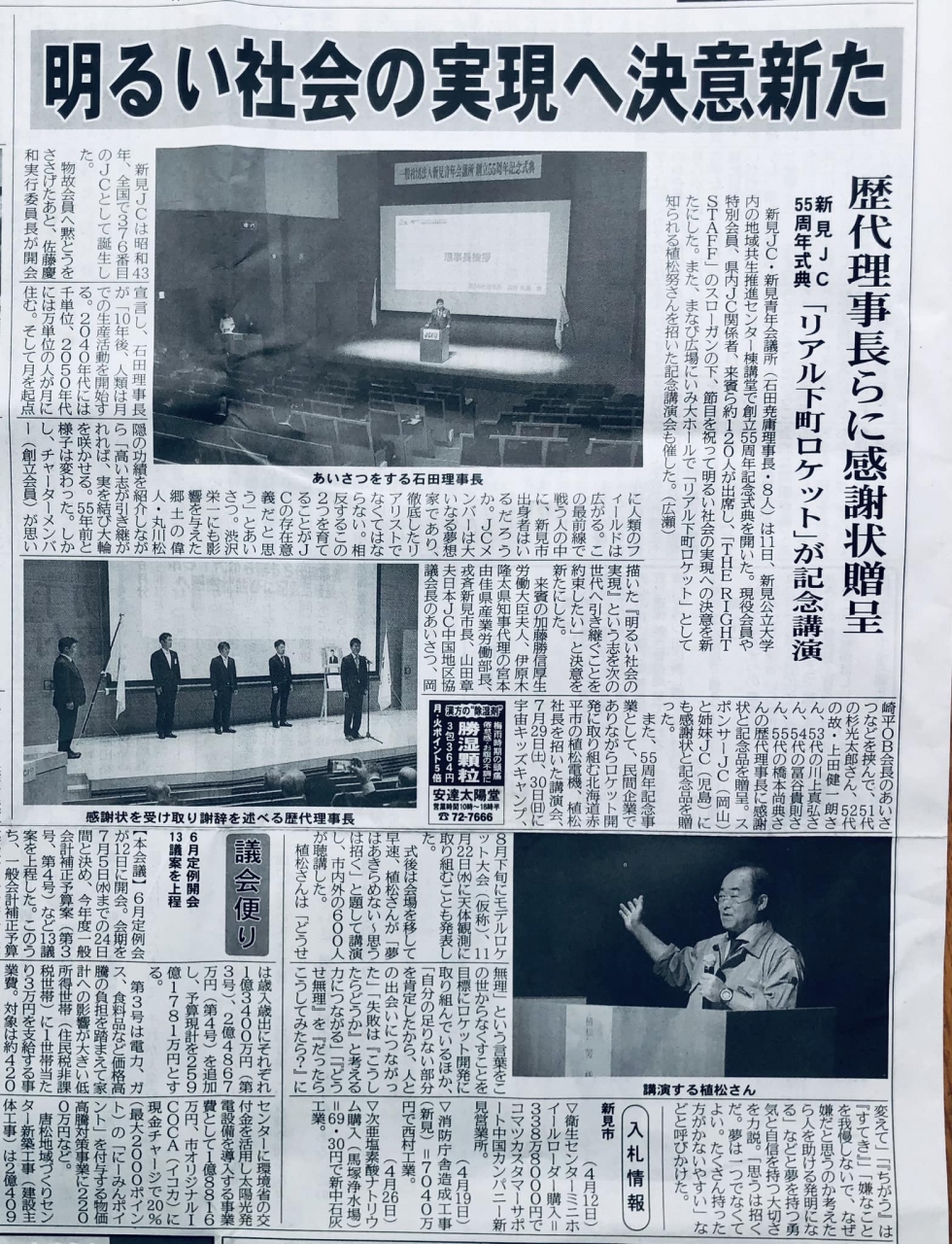 新見の地域紙「備北民報」が、新見青年会議所創立55周年記念式典の様子を伝えている。おめでとうございます。おっ、宮本県産業労働部長、遠路新見へ来てくださったんだ。ありがとう(#^.^#)