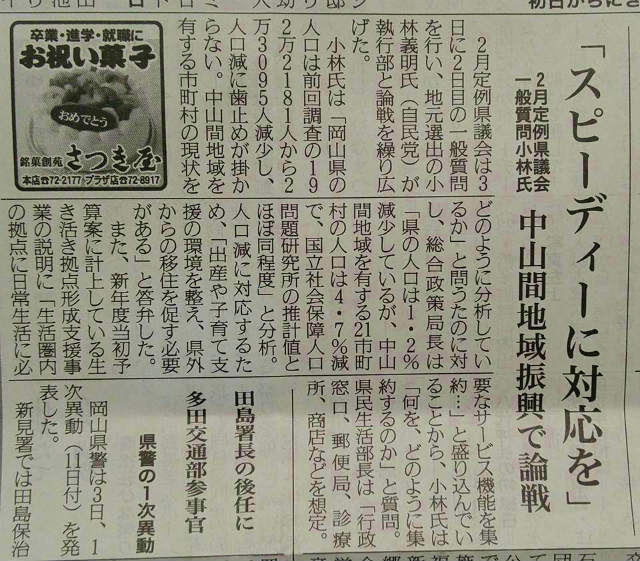 昨日は、「2月定例岡山県議会」で、19回目の一般質問をさせていただきました。新見から多くの傍聴団の方々に来ていただきました。ありがとうございました。