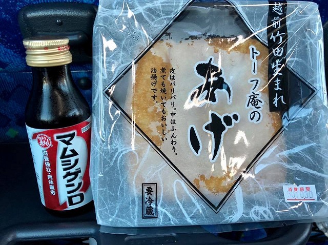 福井県へ移動する道すがら、丸岡あたりで買い求めた厚揚げ豆腐とマムシゲンDであります。