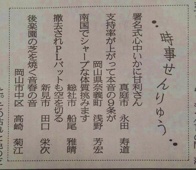 同級生の田口栄次くん、選ばれての掲載100回を超えてなお!凄いなぁ。103回目は、「山陽時事せんりゅう」です。