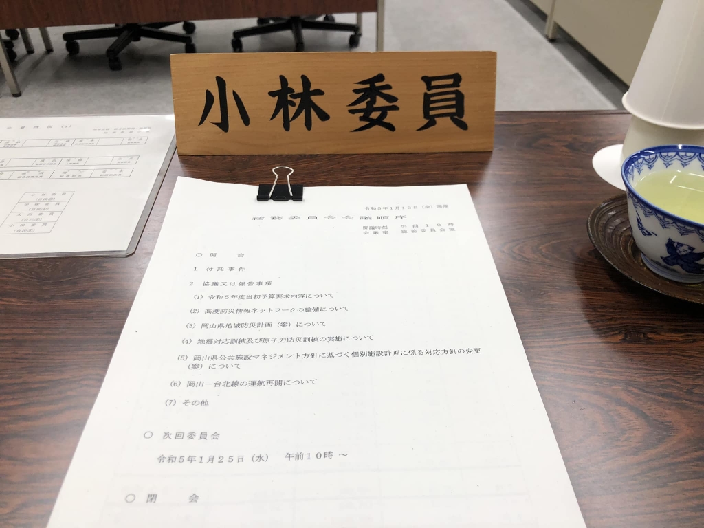 9時から、協議3件。10時から、岡山県議会「総務委員会」。令和5年度当初予算要求内容等について。感謝、感謝です。昼休憩時間に「政友会」。