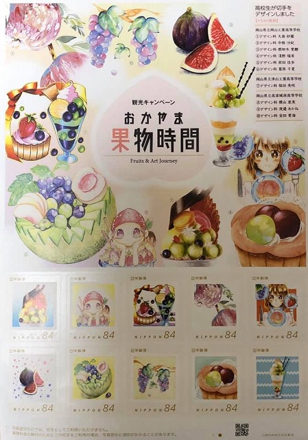 市内を歩くと、様々な情報を頂く。有難いことだ。「高校生が切手をデザインしました」とあった。岡山工業高校、津山工業高校、高梁城南高校の生徒の皆様だ。ありがとうございます。観光キャンペーン「おかやま果物時間」です。