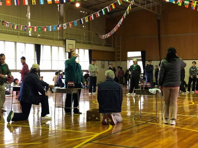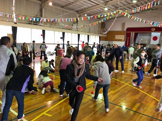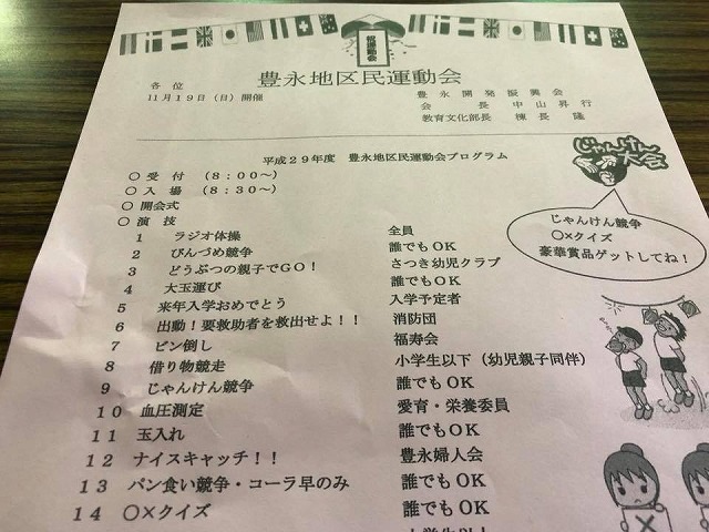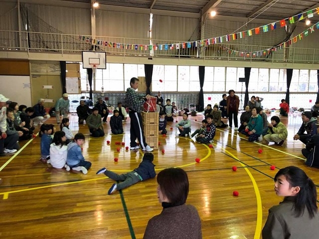 続いて、「旧豊永小学校体育館」で開催されている『豊永地区民運動会』に出席しました。子供たちの歓声が体育館一杯に響きわたっていました。行事を中断して、ご挨拶の機会を作って頂きました。恐縮しております。その後、「パン食い競争」に参加させて頂きました。