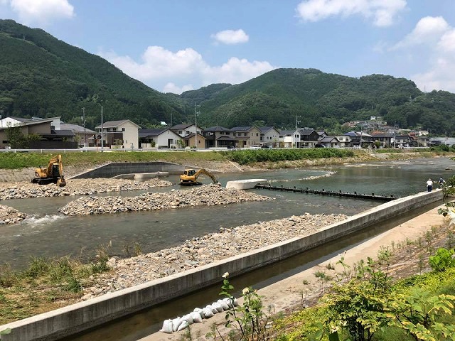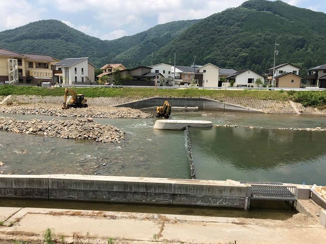 午前中に新見地域事務所で情報共有。それから水舟の高梁川可動堰の復旧現場を視察。堆積した土砂の取り除きが半分終わっています。正田地区の農業用水が流れ始めました。迅速な対応をして頂き、ありがとうございます。