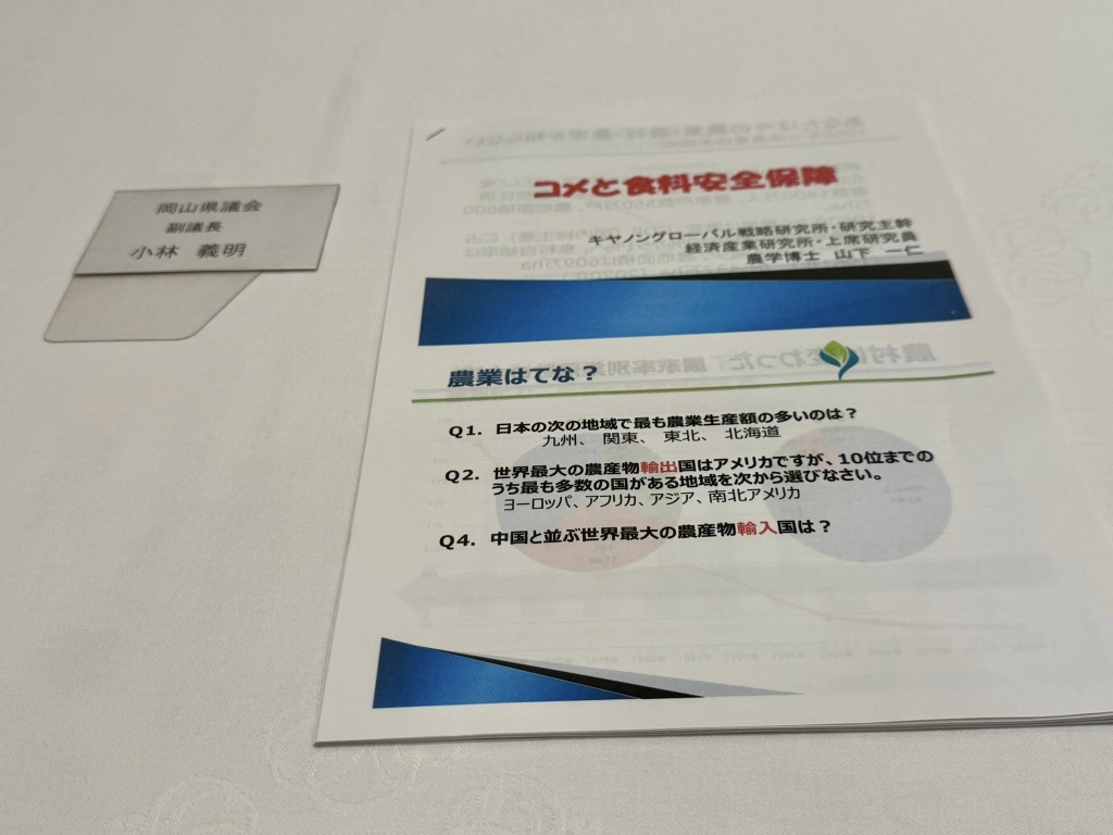 帰宅しました。17時30分から、岡山市内のホテルで開催された「山陽時事問題懇談会」に出席しました。本日の講師は、キャノングローバル戦略研究所研究主幹山下一仁氏。演題は、「米と食料保障」です。講演内容は、明日の山陽新聞で。