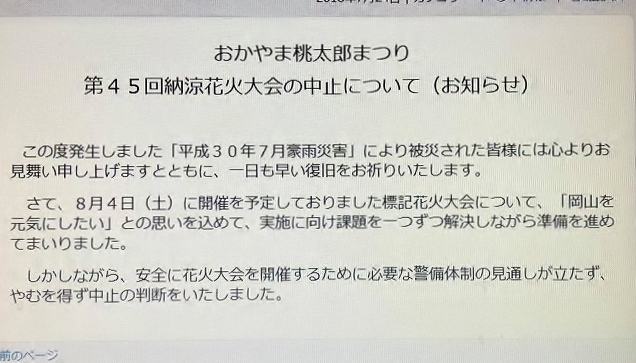 今朝、情報通の県職員さんから、「8月4日の花火大会、中止になりました」と聞いた。