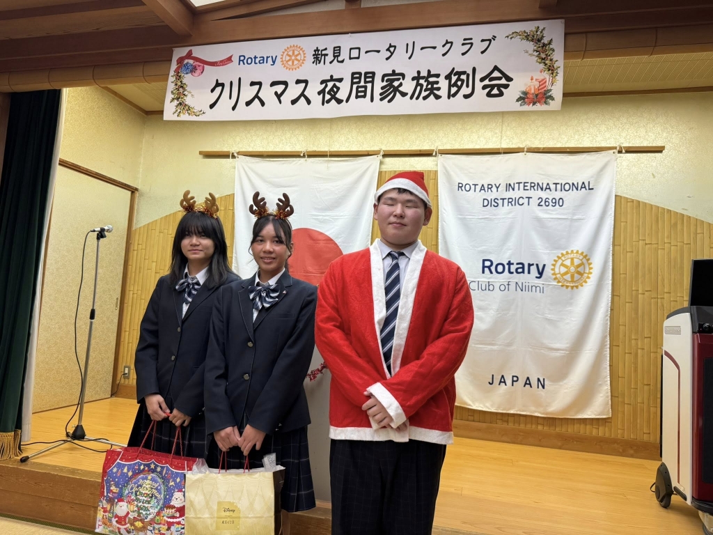 続いて、「新見ロータリークラブクリスマス夜間家族例会」に、岡山共生高校理事長として出席しました。新見ロータリークラブの支援で設立された「インターアクトクラブ」の3年生が招待されています。ありがとうございます。
