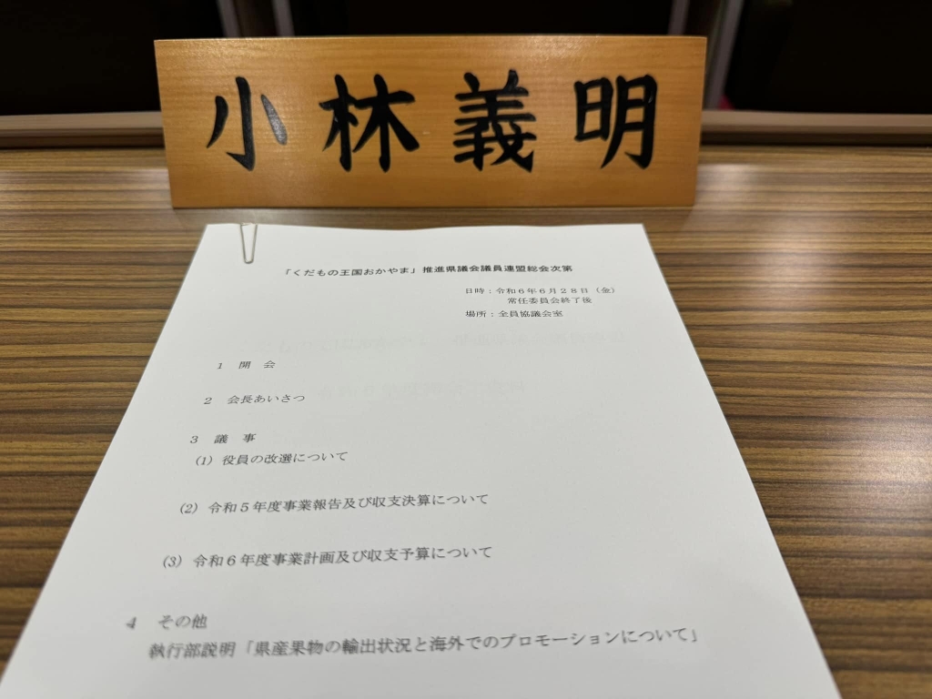続いて、「❝くだもの王国おかやま❞推進県議会議員連盟(内山登)・総会」に出席しました。