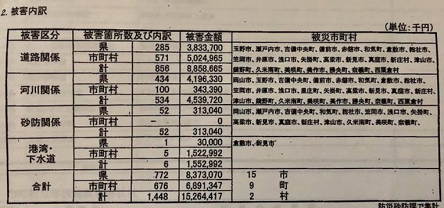 7月14日㈯現在の公共土木施設被害状況は、1,448件、15,264,417,000円。まだ拡大すると思われる。農林水産関係被害も甚大だ。目の前の対策と併せてその先の対策も必要だ。