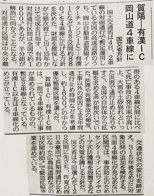 岡山県議会超党派で組織する「岡山道4車線化促進議員連盟(小野泰弘会長)」は、岡山県選出国会議員、岡山県及び関係市町等と岡山道の完全4車線化を目指して取り組んで来ました。その結果が出ました。おめでとうございます。良かった。