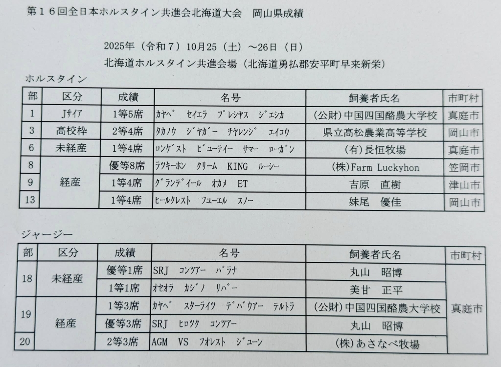 10月25日、26日の両日開催された『第16回全日本ホルスタイン共進会北海道大会』の岡山県代表出品牛の成績です。ご健闘、お疲れさまでした。