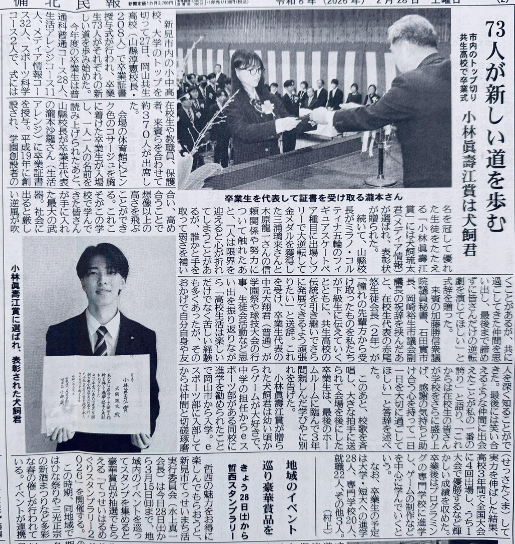 岡山県共生高等学校卒業式。卒業生の皆さん、保護者の皆様、おめでとうございます。素晴らしい人生でありますように。記事は新見の地域紙「備北民報」です。