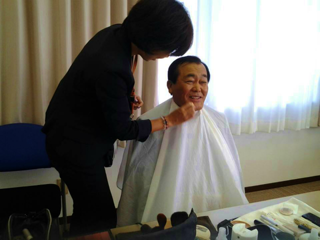 岡山県議会のTV番組の収録が今日行われた。一期生から上田県議が出演したのだが、彼のfacebookに岸本御大の写真が掲載されていた。岸本県議も出演されたのだろう。メイクの最中の様だ。