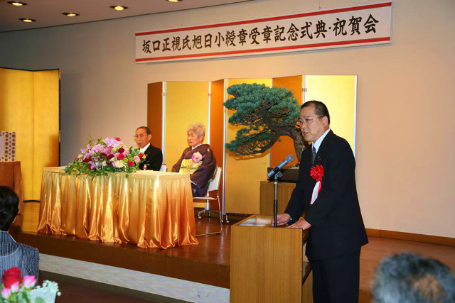 午前10時30分から、前新見市議会議員坂口正視先生の旭日小綬章受章をお祝いする会が開催されました。連続10期、約40年の長きにわたって新見市議会議員を務められた坂口先生の叙勲をお祝いしようと多くの皆様がご出席でした。加藤代議士、逢沢代議士、村田前代議士夫人などが駆けつけ賑やかな会となりました。(Aさ~ん、写真ありがとうございます)
