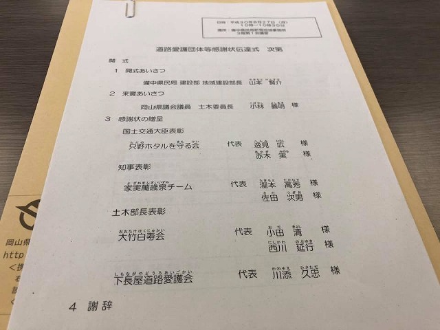 10時から、「備中県民局新見地域事務所」で開催された『平成30年度道路愛護団体等感謝状伝達式』に出席しました。感謝状をお受けになりました4団体の皆様、おめでとうございました。今後ともよろしくお願いします。