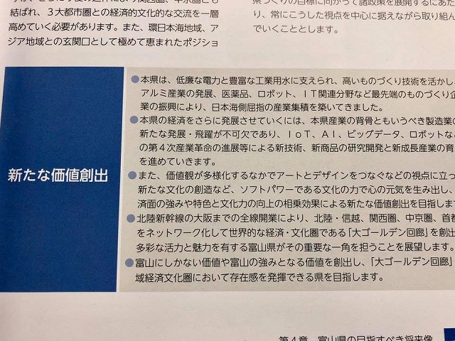 9時30分から富山県庁で、新総合計画「元気とやま創造計画~とやま新時代へ 新たな挑戦~」の策定について調査しました。富山県では、2012年に「新・元気とやま創造計画」を県政運営の指針として策定したが、計画策定から5年以上が経過し、県を取り巻きく社会経済情勢に大きな変化があったことから、本年6月に新たな計画を策定しました。目標年次は2026年度。「新たな価値創出」の理念は素晴らしいと思った。