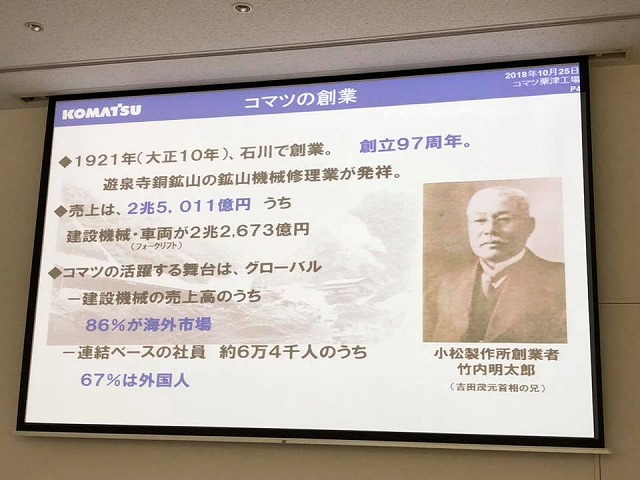 続いて15時から「株式会社小松製作所粟津工場」を訪問して、株式会社小松製作所におけるものづくりと地域との関わりについて調査しました。小松製作所創業者竹内明太郎氏は吉田茂元首相の兄上様だそうだ。