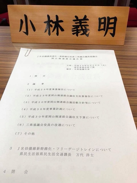 12時から、「全員協議会室」で開催された『JR伯備線高速化・新幹線化促進三県議会議員協議会岡山側連絡会議総会』に出席しました。総会行事の後、県民生活部県民生活交通課の万代洋士課長から、「JR伯備線新幹線化・フリーゲージトレインについて」の現況報告がありました。