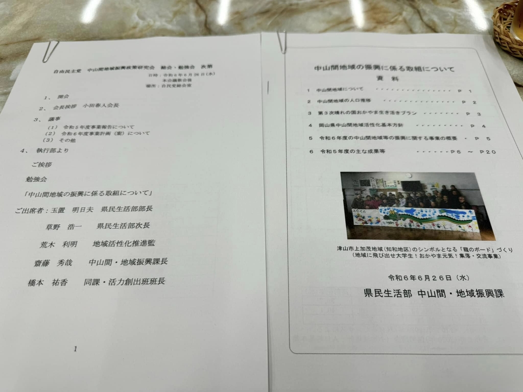 「6月定例岡山県議会」散会後、15時30分から、「自民党中山間地域振興政策研究会(小田春人会長)総会・勉強会」に、副会長として出席しました。