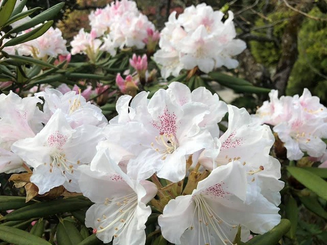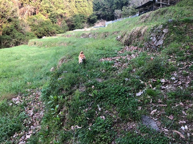 青い空と朝のひかり、若草の中を走り回る小林ふくと今が盛りのシャクナゲの花。いつもの朝であります。本日もよろしくお願いします。頑張りましょう。