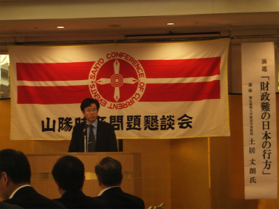 『山陽時事問題懇談会』で講演する土井丈朗慶応大学教授。