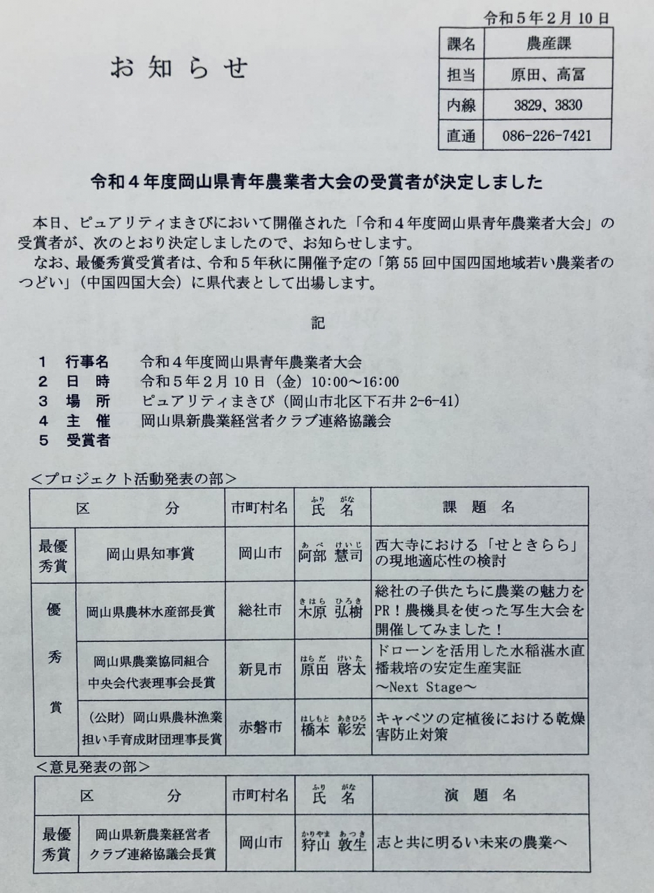 昨日の「令和4年度青年農業者大会」の結果報告です。新見市の原田啓太さん、優秀賞ご受賞おめでとうございます。