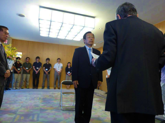 わが町の大将、岡本県選挙管理委員長が、石井正弘氏に参議院議員選挙の当選証書を付与しているの図。素晴らしい。