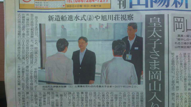 皇太子殿下が岡山を訪問されている。殿下をお迎えする伊原木知事(後ろ姿左)と渡辺県議会議長です。(後ろ姿右)