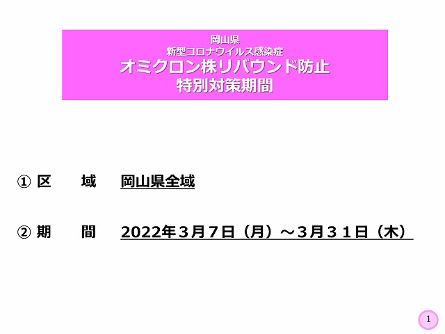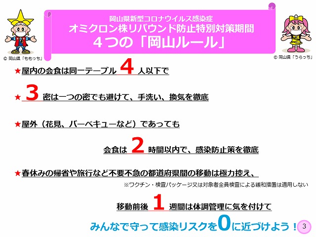 岡山県は、3月7日から「オミクロン株リバウンド防止特別対策期間」です。ご理解ご協力、よろしくお願いします。