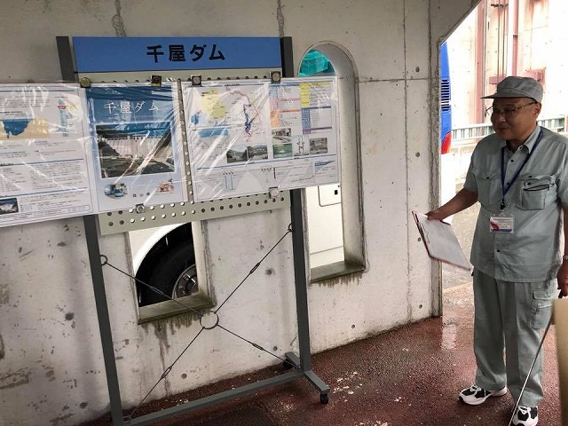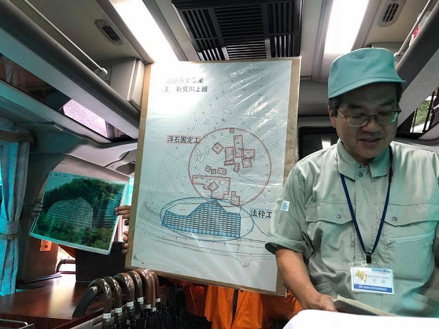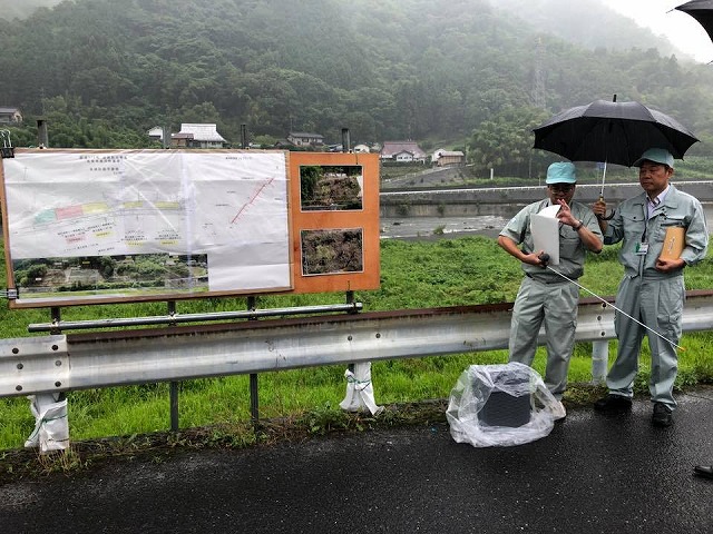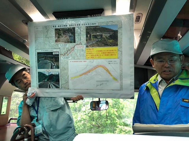 初めに、高梁市管内の道路防災事業313号高梁市成羽町星原、道路防災事業新見川上線高梁市備中町平川を調査。それから新見市管内の道路改築事業新見日南線新見市足立、堰堤(えんてい)事業千屋ダム新見市菅生~坂本)の調査を行いました。