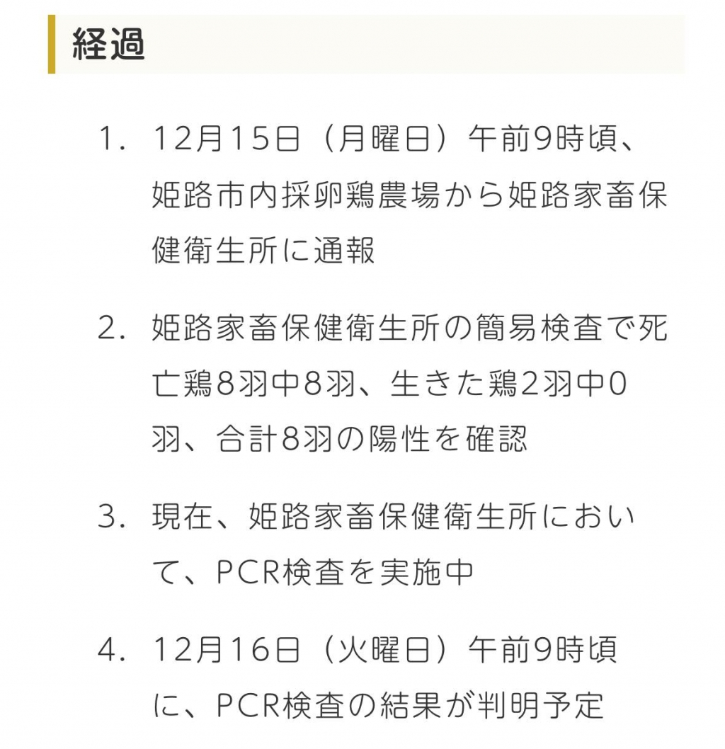 隣県の兵庫県姫路市で、鳥インフルエンザを疑う事例が発生。心配している。