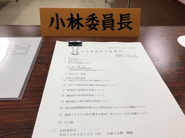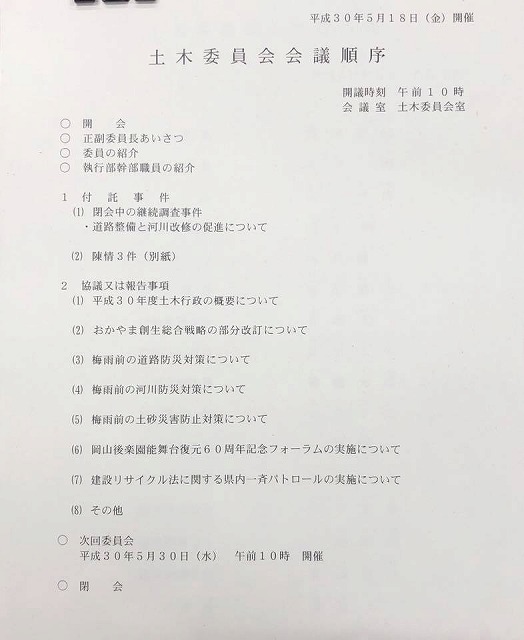 9時から『委員長レクチャー』、福島副委員長と共に執行部と協議。10時から『土木委員会』開会。新体制による委員会開催に当たり、ひと言、ご挨拶を申し上げました。