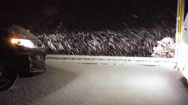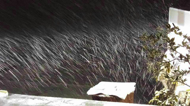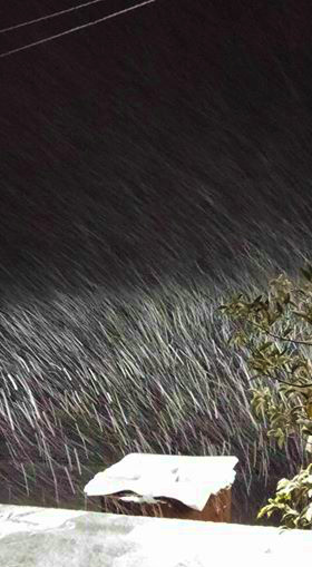 我が家周辺は、大変なことになっております。気温が低いのでしょう、サラサラの雪です。どうやら予報は外れたらしい。雪景色です。