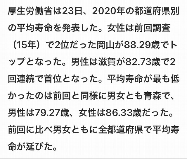 平均寿命の女性1位は、岡山県88.29歳。