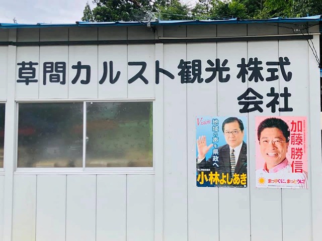 ご厚意を頂いて、加藤勝信先生と私のポスターを掲示させて頂いた。お店には特産の桃がたくさん並んでいた。ありがとうございました。