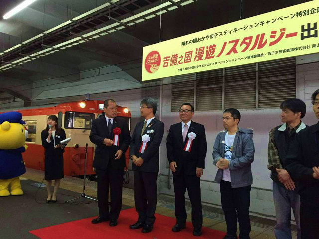 8時30分から「岡山駅」で開催されたJR西日本の晴れの国おかやまディスティネーションキャンペーン『観光列車ノスタルジーでめぐる県内一周ツアー・吉備之国漫遊ノスタルジー出発式』に出席しました。