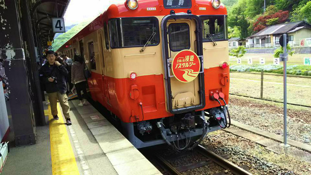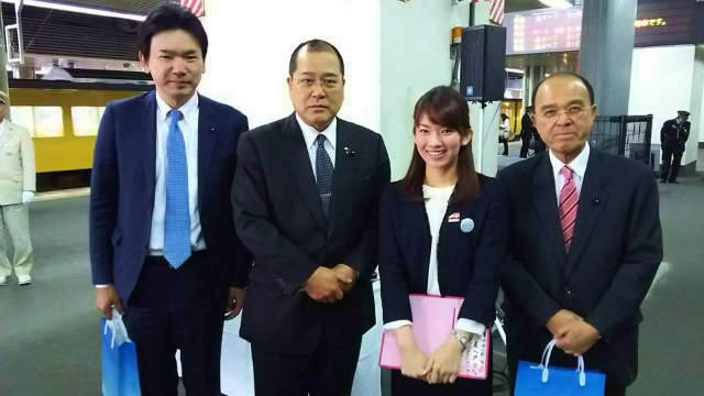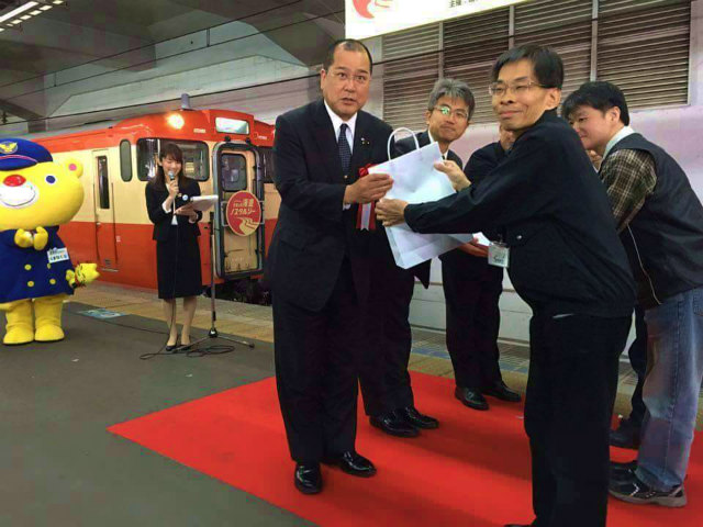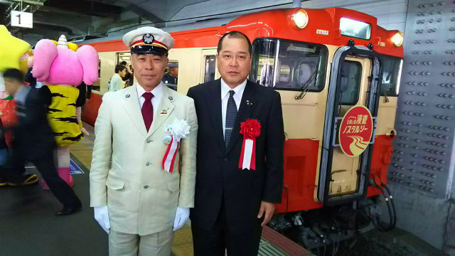 11時30分、新見駅に到着した『吉備之国漫遊ノスタルジー』の皆様ををお出迎えしました。ようこそ新見へ!高梁駅では近藤市長がお出迎えされたそうです。