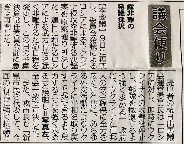 新見市議会、ロシアによるウクライナ侵攻を非難する決議案を、全会一致で可決した。地域紙「備北民報」が伝えている。