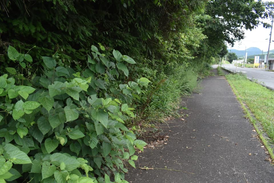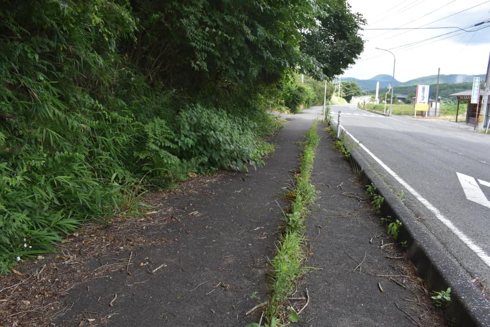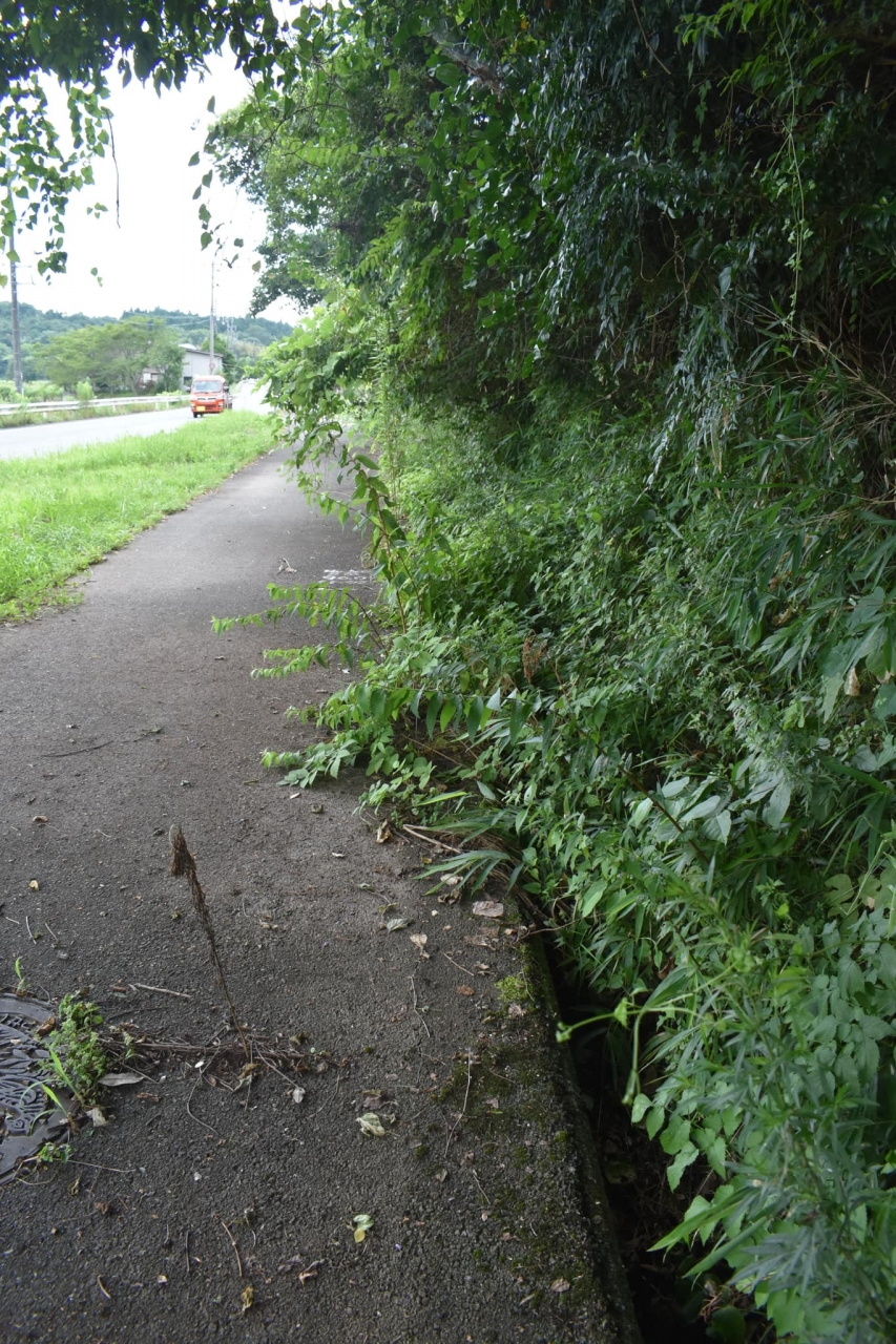 国道182号新見市哲西町大竹地内、「側溝に草が生い茂り、側溝をふさいで、雨水が歩道(通学路)にあふれ出る。何とかならないか。」と、ご要望を頂きました。安達動物病院から新見より300m付近。500m~600m区間。