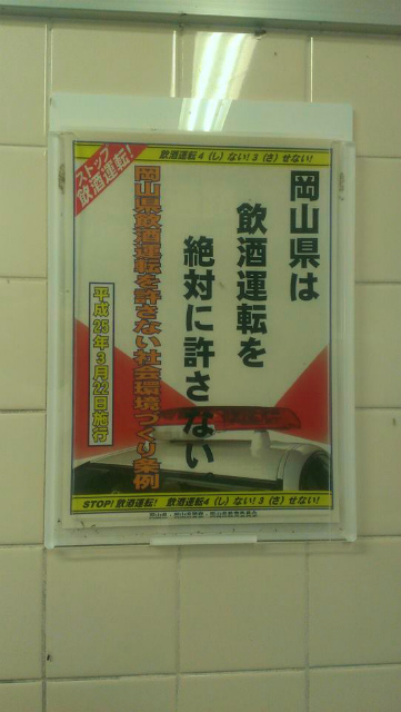 帰り道、総社パーキングのトイレで、これを見つけました。議員発議で制定した「岡山県飲酒運転を許さない社会環境づくり条例」のお知らせポスター。新見市議会でもどうでしょうか。