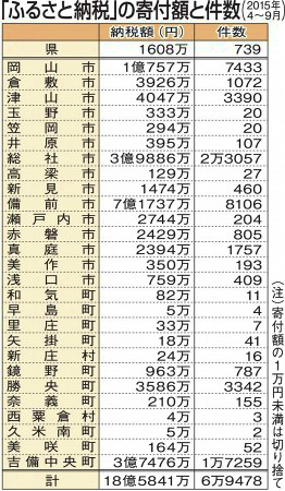 岡山県と県内27市町村への2015年度上半期(4~9月)の「ふるさと納税」額が、18億5841万円にのぼり、2014年の4倍を超えたことが県のまとめで分かった。