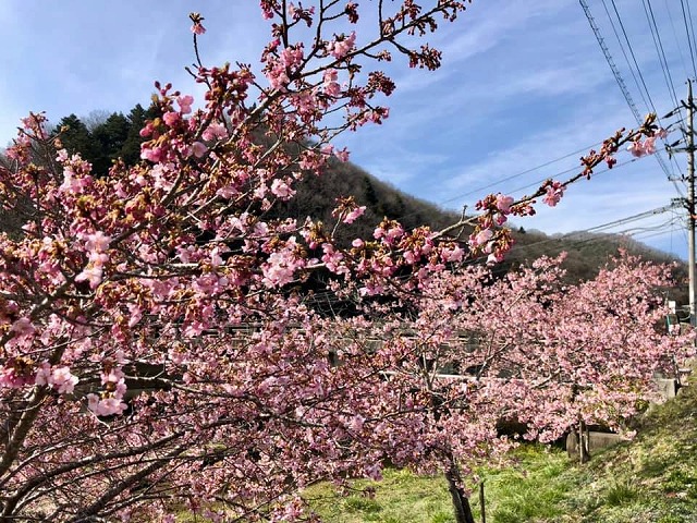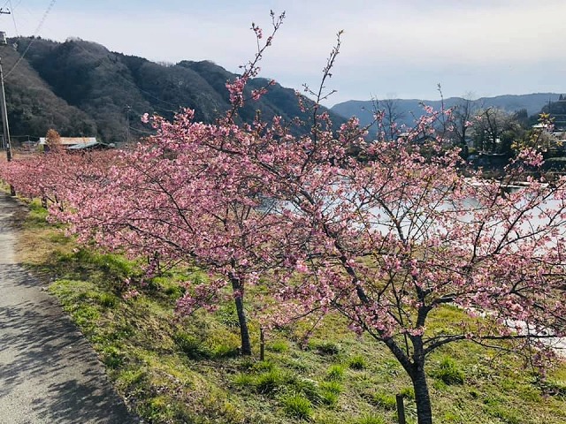 帰宅しました。住まいする新見市唐松の河津桜です。奇麗に咲いてます。キャビアのMSファーム株式会社近くの小坂部川です。
