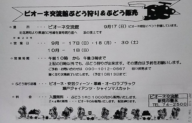 明日17日㈰開催の『ピオーネ交流館ぶどう狩り&ぶどう販売』が、予定通り開催されると聞きました。気を付けてお出かけ下さい。お知らせです。