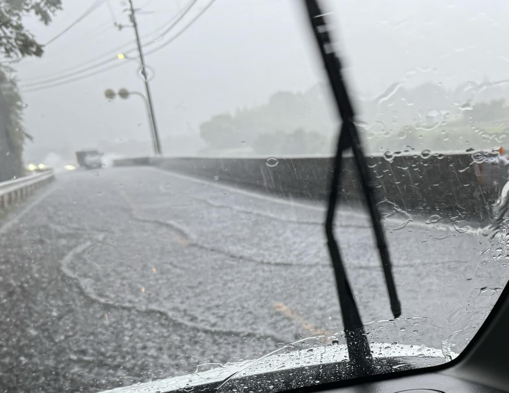 雷が鳴って、激しく雨が降った。国道180号、広瀬橋付近。道路の雨水がはけないので、波立っていた。一時停止して、安全確認。